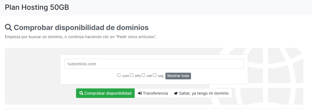 Una vez iniciado el formulario de orden de compra, Ignora el primer paso del formulario de búsqueda de dominios (.com, .net, etc.) y haz clic en el botón «Saltar, ya tengo mi dominio» (botón claro con ícono de mano apuntando derecha). Esto avanza sin registrar dominio nuevo.