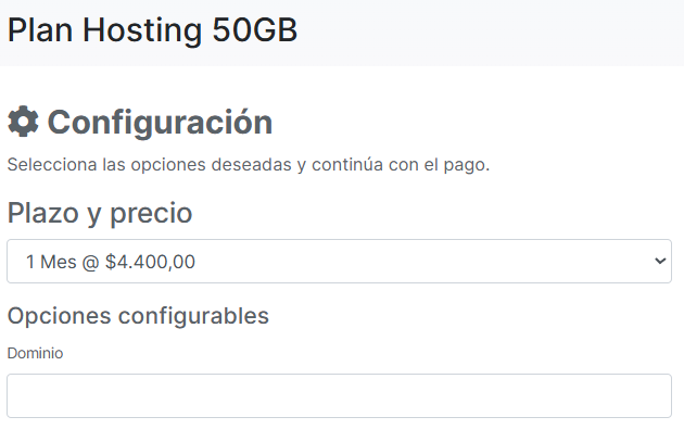 En la pantalla de resumen del Plan Hosting, verifica detalles como el ciclo de facturación (mensual/trimestral/semestral/anual). Haz clic en «Continuar» o «Siguiente» para proceder a opciones configurables.